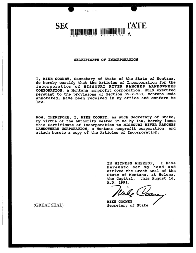 In 1991 the Missouri River Ranches Landowners Corporation was formed. Each year a Board of Directors was elected/appointed by the Landowners. The problem is and has been that the entire Board of Directors elected/appointed by the Landowners were never listed as the Board of Directors in the Corporate State filings. In some filings Board Members that were never elected/appointed by the Landowners were listed as Board Members (e.g. John Buchanan) in the State Filings.